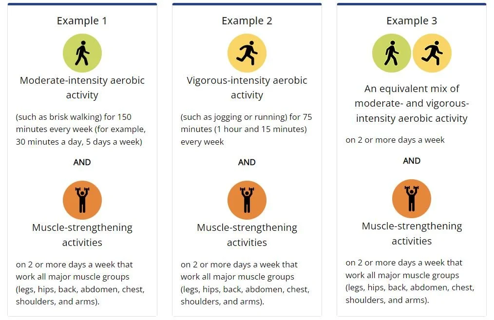 AEROBIC ACTIVITY: at least 150 minutes of moderate aerobic activity or 75 minutes of vigorous aerobic activity a week, or a combination of moderate and vigorous activity